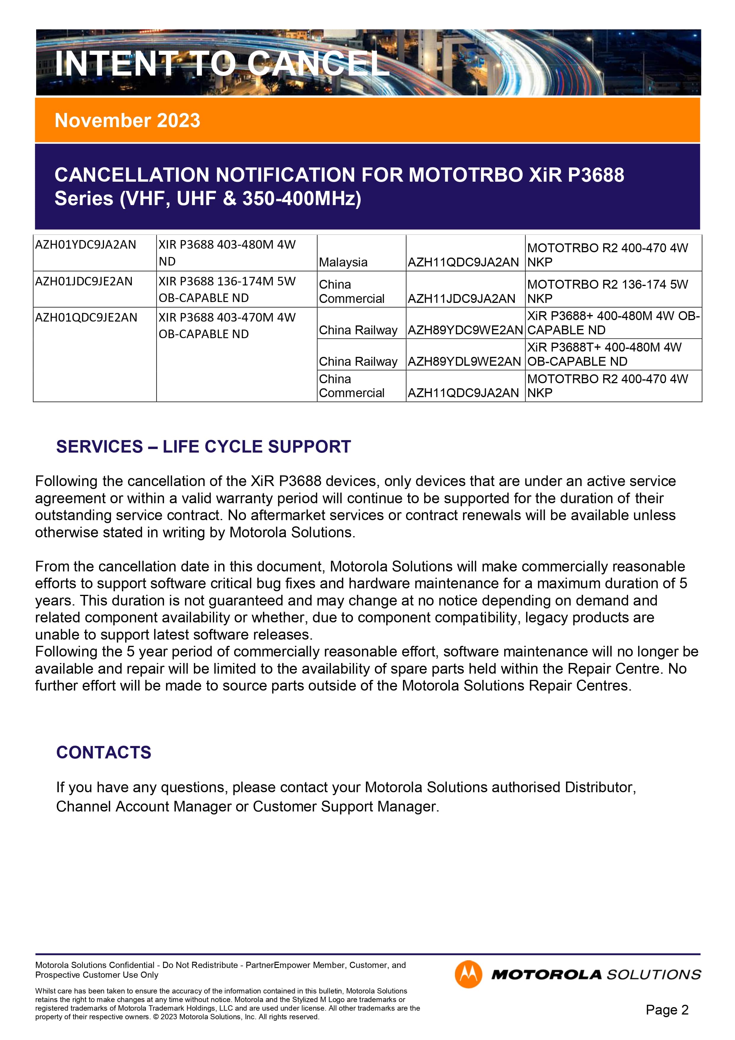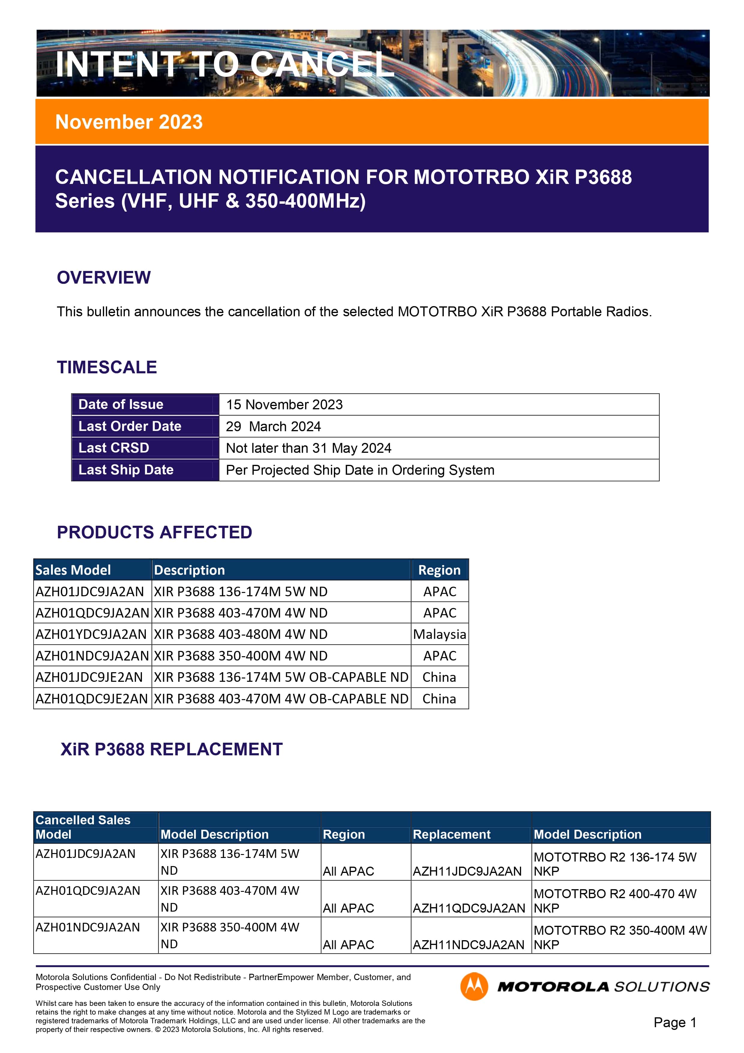 Kể từ tháng 11/2023, hãng Motorola Solutions chính thức thông báo ngừng sản xuất dòng máy bộ đàm Motorola XiR P3688 (thuộc dòng MOTOTRBO) tại khu vực Châu Á – Thái Bình Dương.